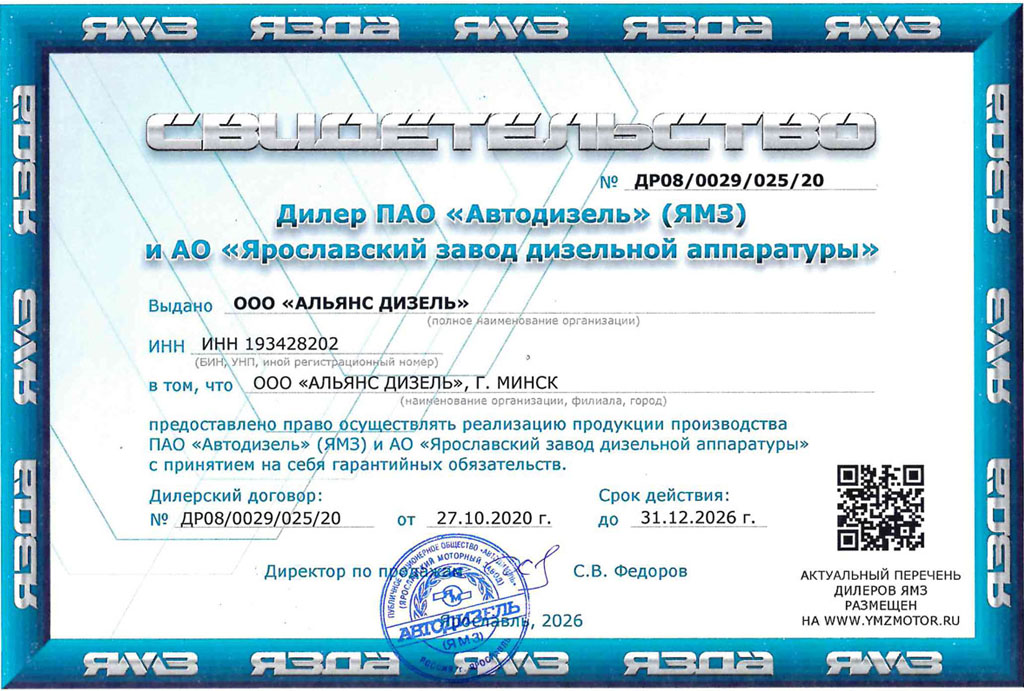 Компания ООО “Альянс Дизель” является официальным дилером ПАО “Автодизель” (ЯМЗ) и АО “Ярославский завод дизельной аппаратуры” и реализует продукцию данных производителей с принятием на себя гарантийных обязательств.